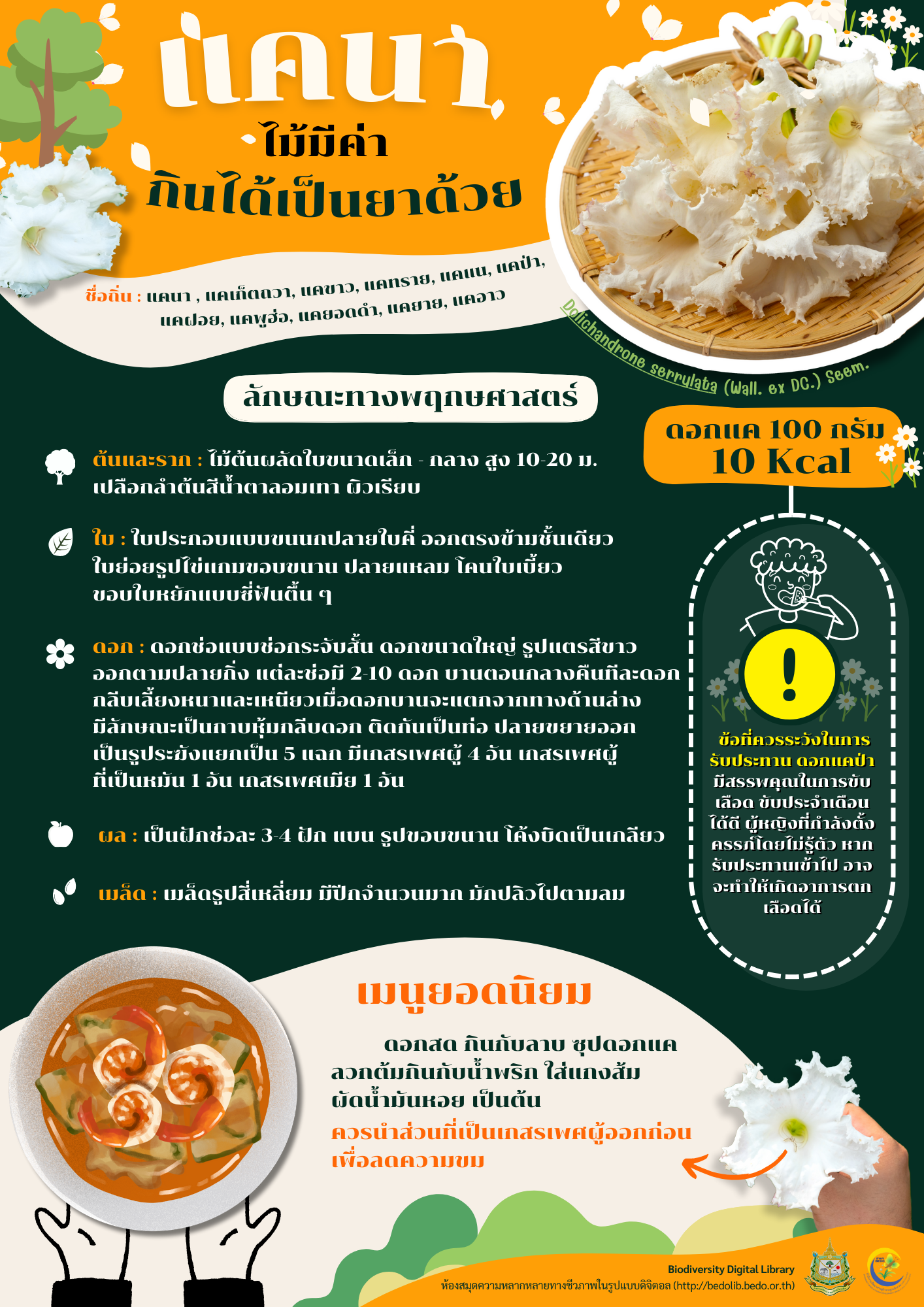 “แคนา” เป็น 1 ในไม้มีค่าทางเศรษฐกิจ และนิยมปลูกเพื่อประดับสวน ทรงพุ่มสวยงาม ให้ร่มเงาได้ดี และโตเร็ว เมื่อดอกบานชาวบ้านในท้องถิ่นจะนำดอกมารับประทานคู่กับน้ำพริก ทั้งแบบรับประทานสด และแบบลวกหรือนำไปทำเมนูแกงส้ม ผัดน้ำมัน และหลายเมนูอย่างอร่อยและได้ประโยชน์ มีรสชาติขมนิด ๆ เก็บได้ทุกวันเพราะดอกจะร่วงในเฉพาะช่วงเช้าตรู่ของทุกวันดอกแคนาจะค่อยๆ บานทีละดอก ดอกบานในตอนกลางคืน และจะออกดอกในช่วงเดือนมีนาคมถึงเดือนมิถุนายน